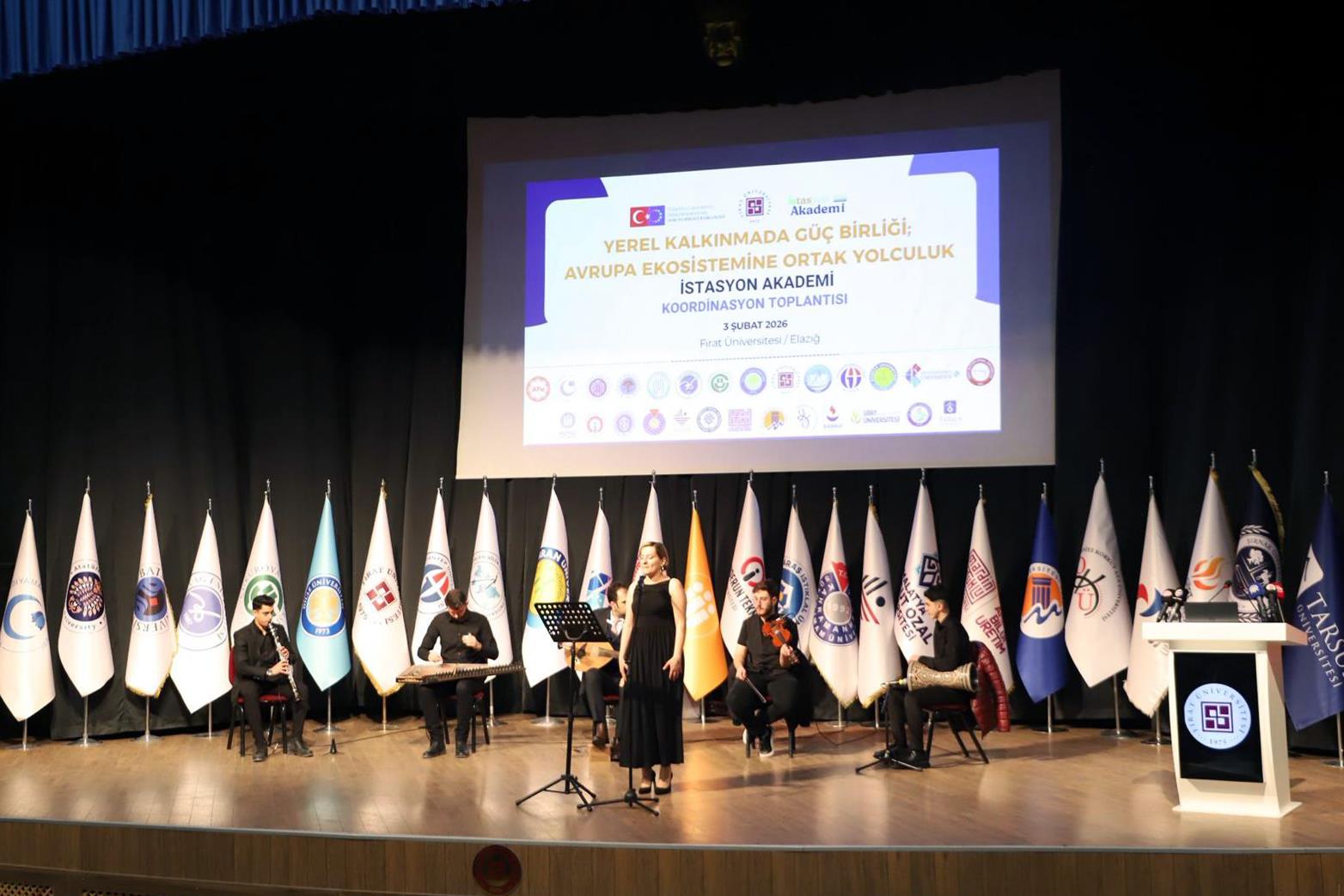 “Yerel Kalkınmada Güç Birliği: Avrupa Ekosistemine Ortak Yolculuk” temasıyla düzenlenen toplantı, Fırat Üniversitesi Devlet Konservatuvarı Dr. Öğr. Üyesi Serap Yağmur İlhan, Öğr. Gör. Ahmet Tevfik Yücesu ve konservatuvar öğrencilerinin eşliğinde Elâzığ yöresine ait eserlerin seslendirilmesi ile başladı.